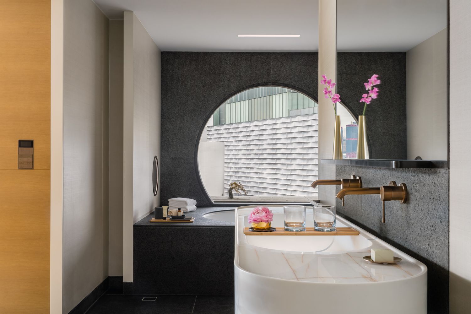 深受中式庭园概念启发的映月门,打造别树一帜的沐浴概念,推开一扇趟门,即可从独立式浴缸欣赏海港的如画景致。