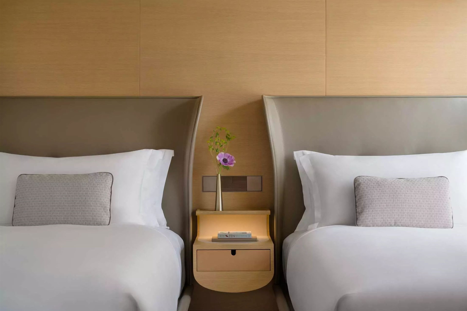 于客房,通过木材、皮革、织物、玻璃及石材的组合设计,设计师卢志荣用轻松的色调、和谐细致的布局、框画般的造景等丰富的设计语言,将酒店所有客房和套房均经过重新设计,打造成私享之境,营造宁静祥和氛围。